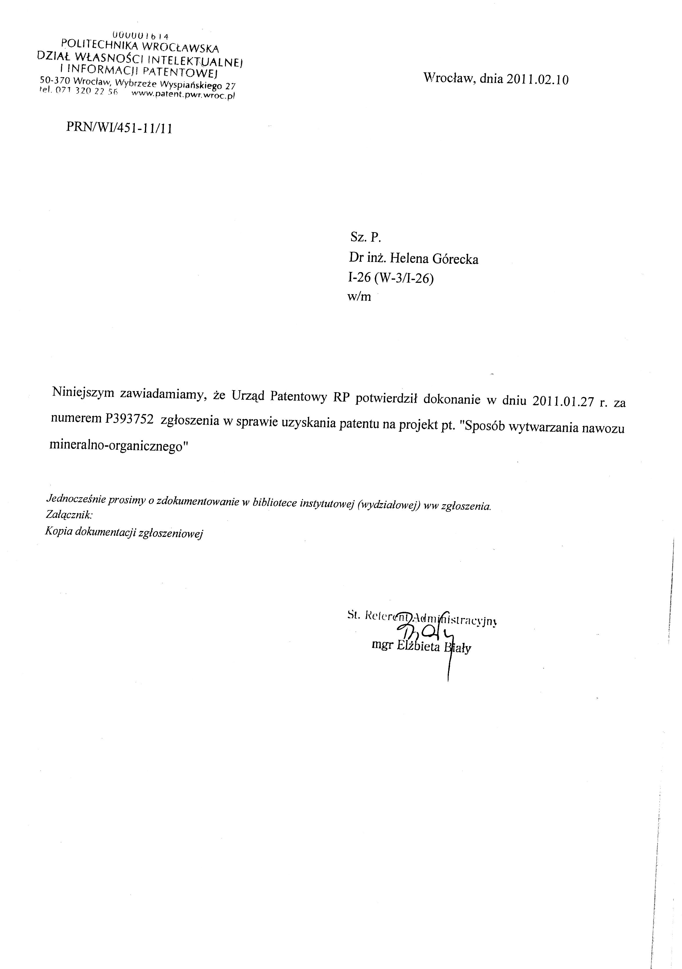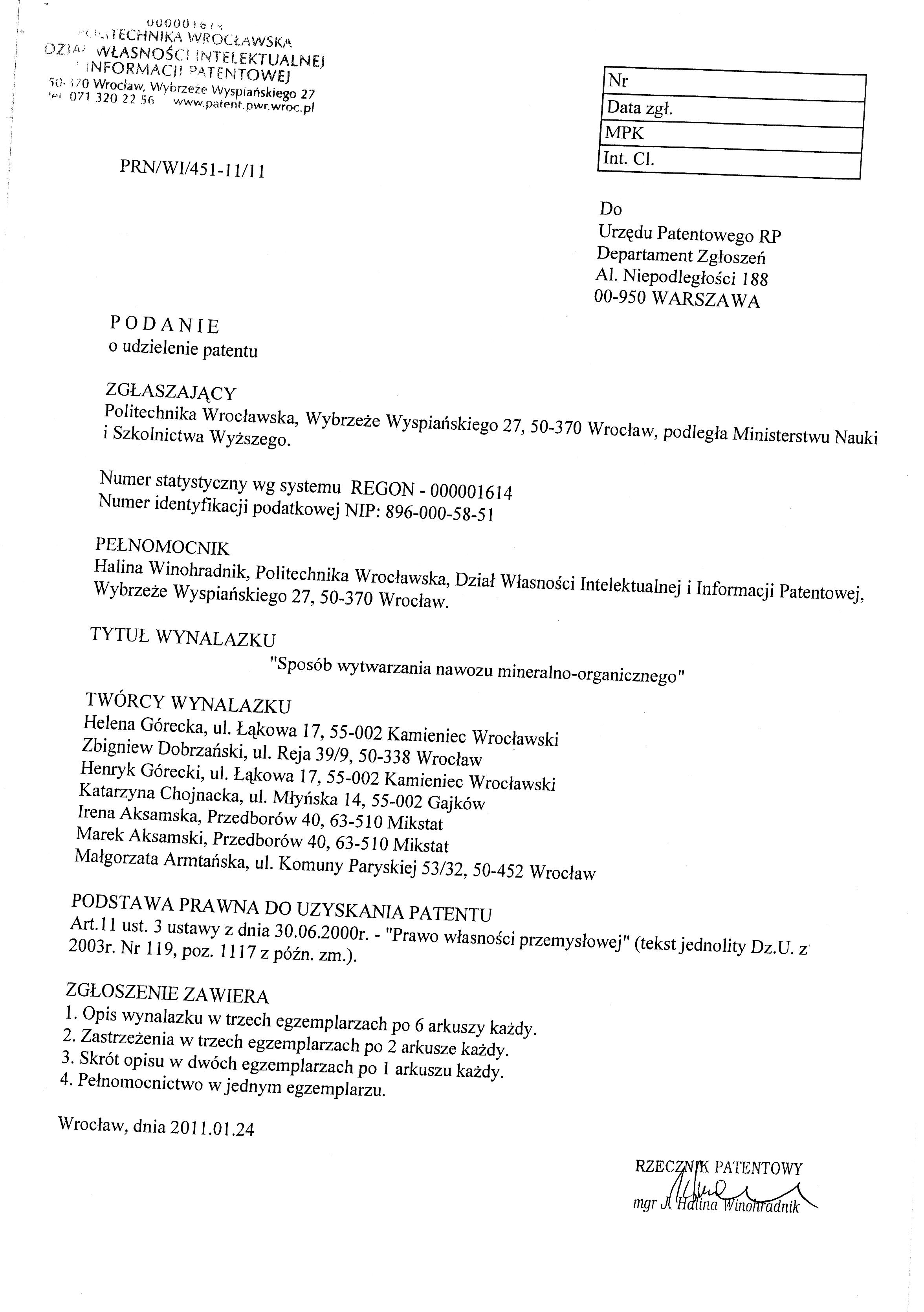 Potwierdzenie dokonania zgloszenia "Sposób wytwarzania nawozu mineralno-organicznego" H. Górecka, Z. Dobrzanski, H. Górecki I. Aksamska, M. Aksamski